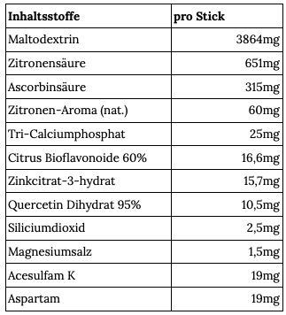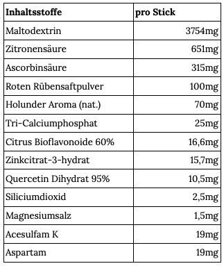 Zitronensäure, Vitamin C, Flavonoide, Zink, Quercetin, Holunder Aroma bzw. Zitronen Aroma, Acesulfam K, Aspartam.