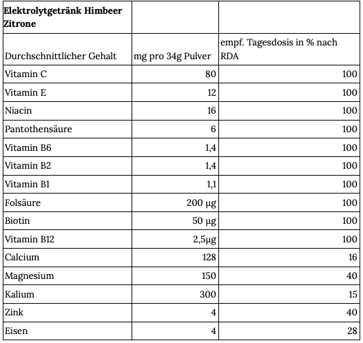 Dextrose, Zitronensäure, Magnesiumgluconat, Calciumlactat, L-Ascorbinsäure, DL-alpha Tocopherolacetat, Nicotinamid, Calcium-D-pantothenat, Riboflavin, Pyridoxinhydrochlorid, Thiaminmononitrat, Pteroylmonoglutaminsäure, D-Biotin, Cyanocobalamin, Calciumcitrat, Natriumchlorid, Magnesiumcitrat, Calciumcarbonat, Maltodextrin, Zinkgluconat, Eisenpyrophosphat, Betenrot, Beta-Carotin, Acesulfam K, Sucralose, Magnesiumkaliumcitrat, Zitronenfruchtpulver.