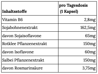 Sojabohnenextrakt, Rotklee Pflanzenextrakt, Salbei Pflanzenextrakt, Pyridoxal-5′-phosphat, Maisstärke, Hydroxypropylmethylcellulose.