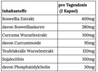 Boswellia Extrakt (indischer Weihrauch), Teufelskralle Wurzelextrakt, Curcuma Wurzelextrakt, Sojalecithin, Maisstärke, Hydroxypropylmethylcellulose.