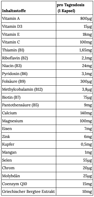 Tricalciumphosphat, Magnesiumoxid, Calcium-L-ascorbat, Eisengluconat, D-alpha-Tocopherylacetat, Nicotinamid, Coenzym Q10, Natriumselenit, Griechischer Bergtee Extrakt, Calcium-D-pantothenat, Zinkoxid, Cholecalciferol, Retinylacetat, Mangansulfat, Pyridoxinhydrochlorid, Natriummolybdat, Thiaminmononitrat, Chrom(III)chlorid, Kupfercitrat, Natriumphosphat, Pteroylmonoglutaminsäure, D-Biotin, Methylcobalamin, Hydroxypropylmethylcellulose.