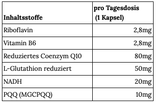 Ubichinol (reduziertes Coenzym Q10, enthält Soja), L-Glutathion reduziert, Nikotinamid-Adenin-Dinukleotid reduziert (Dinatriumsalz), Pyrrolochinolichinon-Dinatriumsalu (MGCPQQ), Natrium-Riboflavin-5′-phosphat, Pyridoxal-5′-phosphat, D-Ribose, Hydroxypropylmethylcellulose.